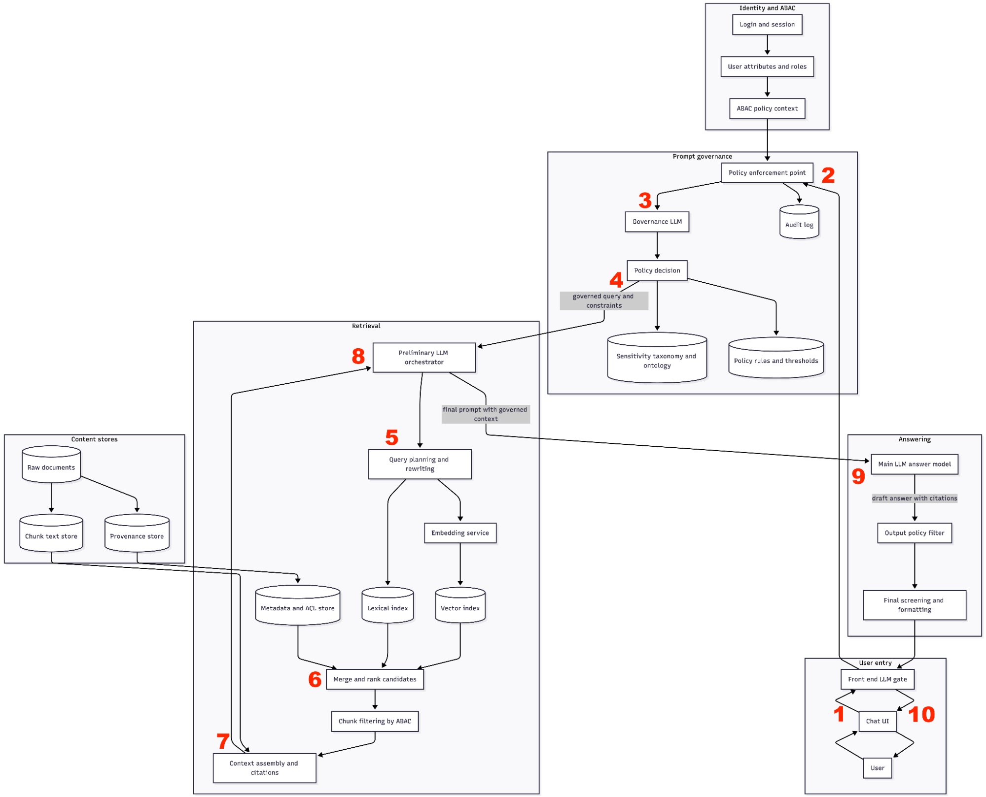The result: ten discrete governance checkpoints between the user’s question and the system’s answer, each independently auditable. This is not a feature bolted onto a chatbot. It is a governance architecture designed from the ground up for institutions where data classification, need-to-know, and audit trails are regulatory requirements.