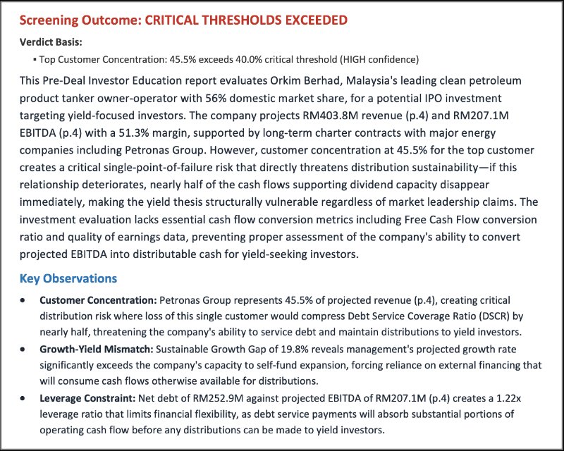 The critical differentiator: the same company receives a different verdict depending on your thesis. A company with 45% customer concentration is a critical risk for a yield investor — one customer loss breaks debt service — but a monitor-level finding for a strategic acquirer buying the IP, not the customer list. Same document. Same extraction. Different computation.